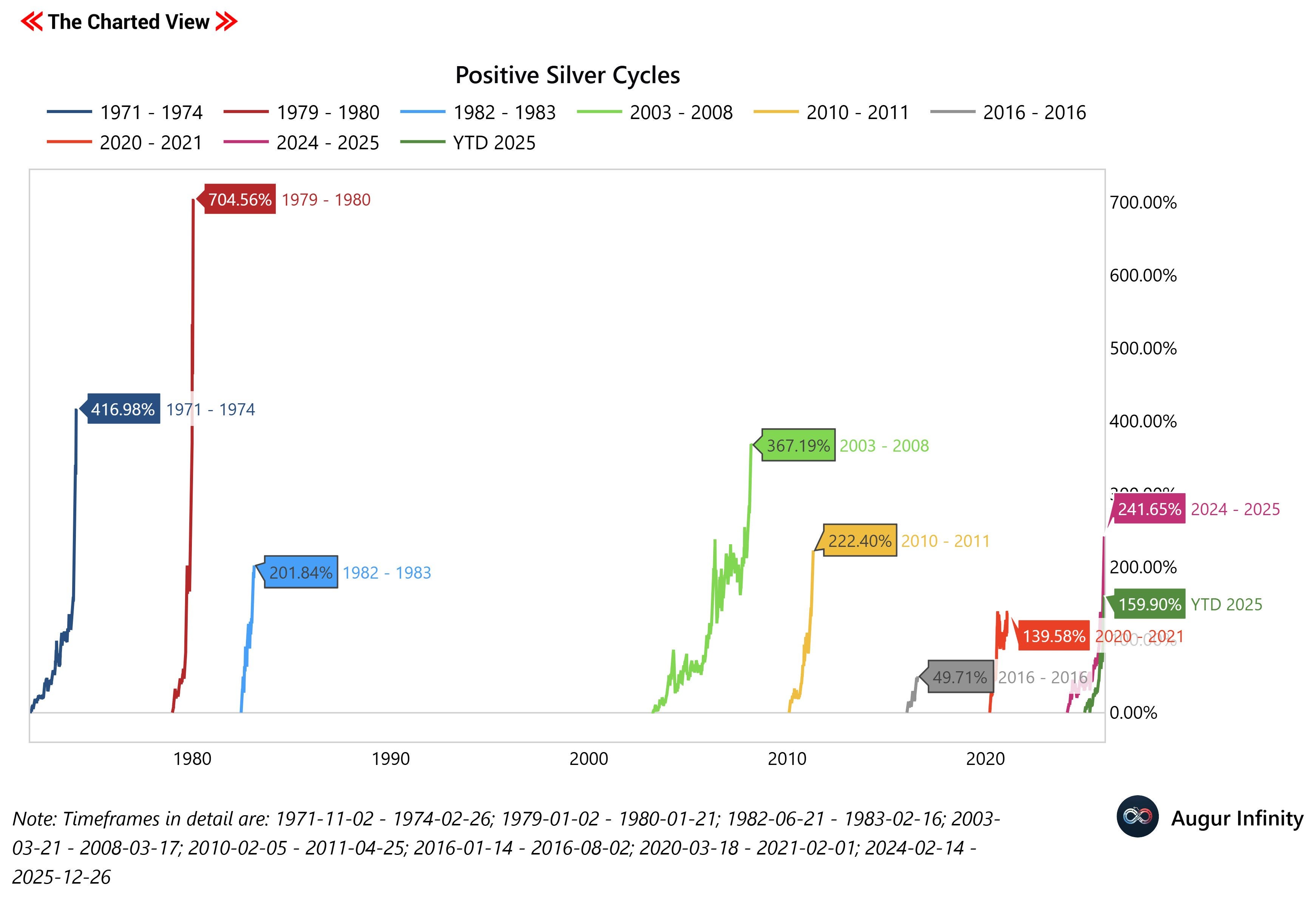 This chart shows the % gains in silver for each cycle from start to end. As you can see, only three cycles boasted higher returns than the current one.